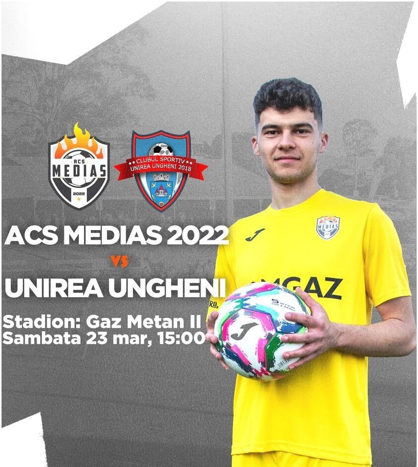 Partida CS Mediaș – CS Unirea Ungheni 2018 se va juca pe Stadionul Gaz Metan 2(8 Mai), sâmbătă, 23 aprilie, de la ora 15.00. Biletele costă 10 lei, iar minorii au acces gratuit.