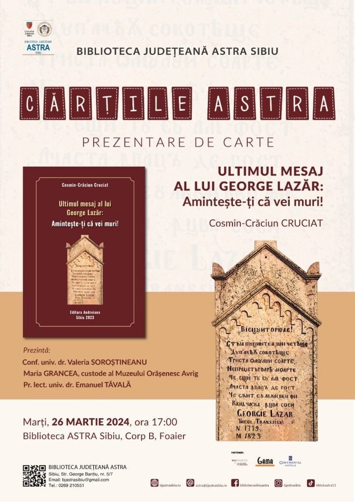 Biblioteca Județeană ASTRA Sibiu, instituție ale cărei acțiuni sunt posibile cu susținere financiară din partea Consiliului Județean Sibiu, invită publicul larg la prezentarea volumului „Ultimul mesaj al lui George Lazăr: Amintește-ți că vei muri!” semnat de Cosmin-Crăciun Cruciat. Evenimentul va avea loc în Foaierul bibliotecii publice sibiene, în 26 martie 2024, la ora 17:00. Autorului i se vor alătura conf. univ. dr. Valeria Soroștineanu, d-na Maria Grancea, custode al Muzeului Orășenesc Avrig, pr. lect. univ. dr. Emanuel Tăvală și dr. Răzvan Pop, manager al Bibliotecii ASTRA Sibiu.