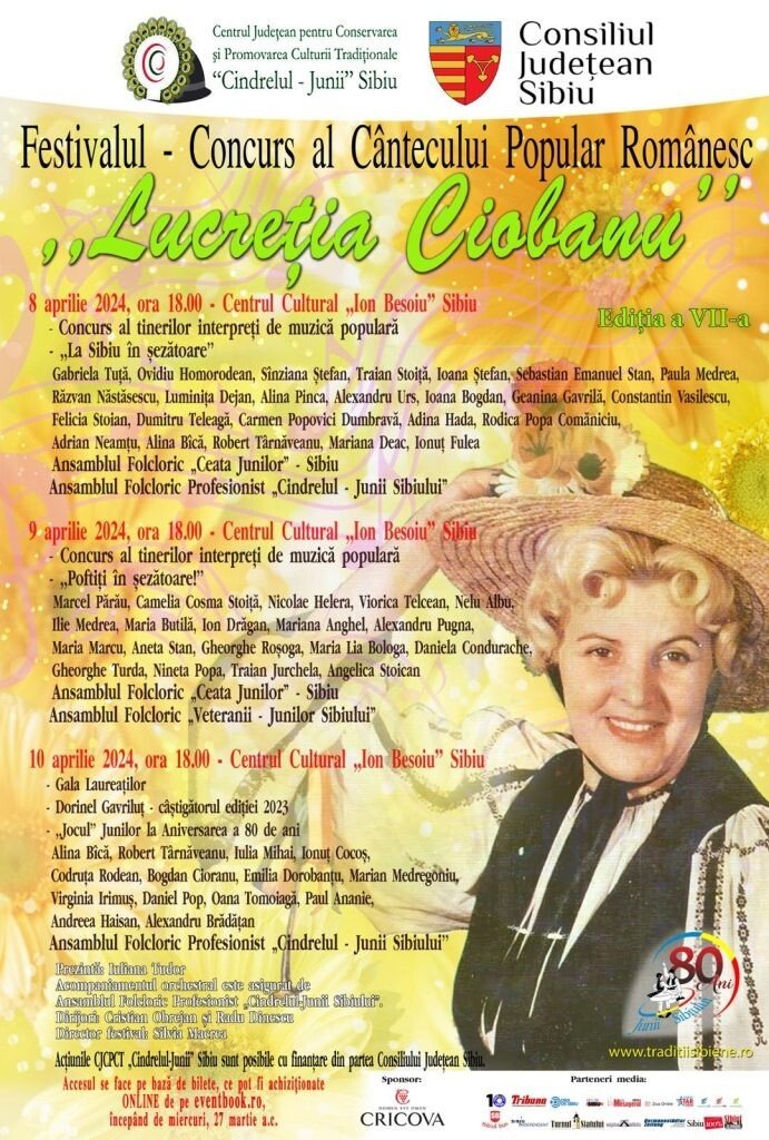 Valoroși interpreți de muzică populară și membrii Ansamblurilor „Cindrelul-Junii Sibiului”, „Veteranii Junilor Sibiului” și „Ceata Junilor” vor urca pe scena Festivalului-Concurs „Lucreţia Ciobanu” din Sibiu, în zilele de 8, 9 și 10 aprilie 2024. * Biletele se pun în vânzare miercuri 27 martie, online pe eventbook.ro.