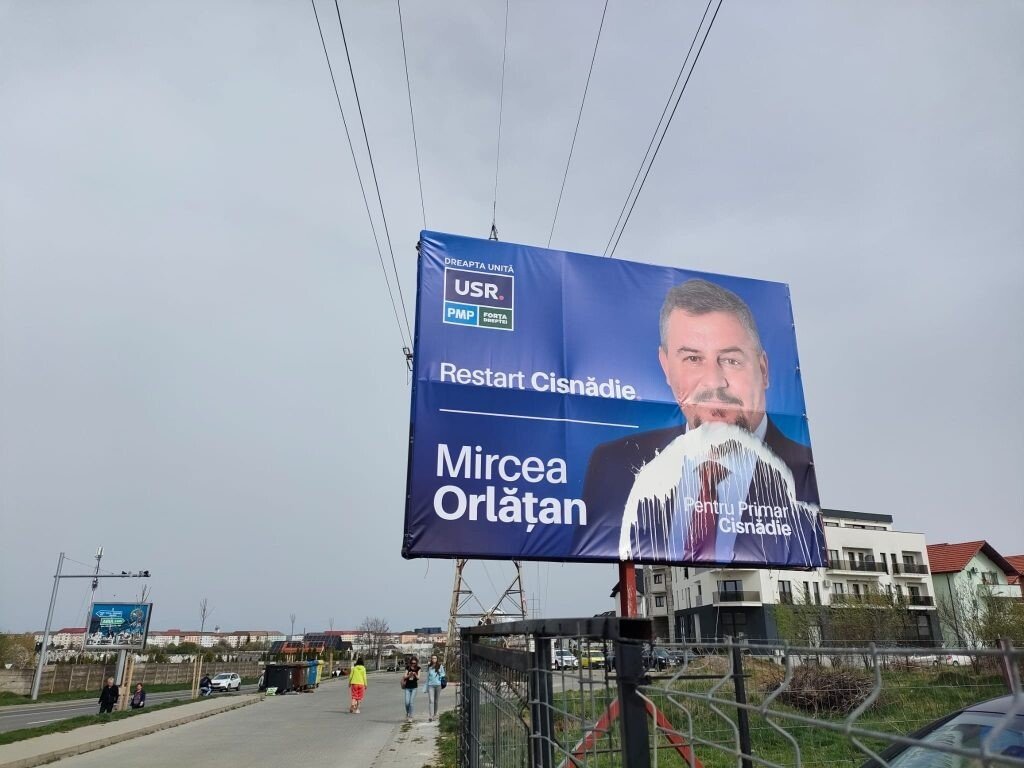 Disperați că-și vor pierde privilegiile și accesul la banii Cisnădiei, susținătorii primitivi ai actualei conduceri PNL a orașului au vandalizat panoul publicitar al candidatului Alianței Dreapta Unită la Primăria Cisnădie, Mircea Orlățan.