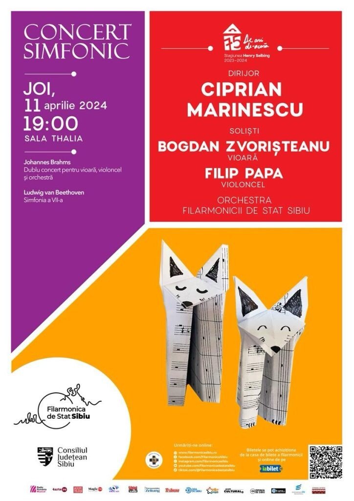 Dirijorul Ciprian Marinescu va conduce următoarele concerte ale Filarmonicii de Stat Sibiu. Publicul este invitat, joi, 11 aprilie, la un concert simfonic al cărui soliști vor fi violonistul Bogdan Zvorișteanu și violoncelistul Filip Papa, iar vineri, 12 aprilie, revine “Simfonia Bebemol”, concertul pentru bebeluși și viitoare mămici.