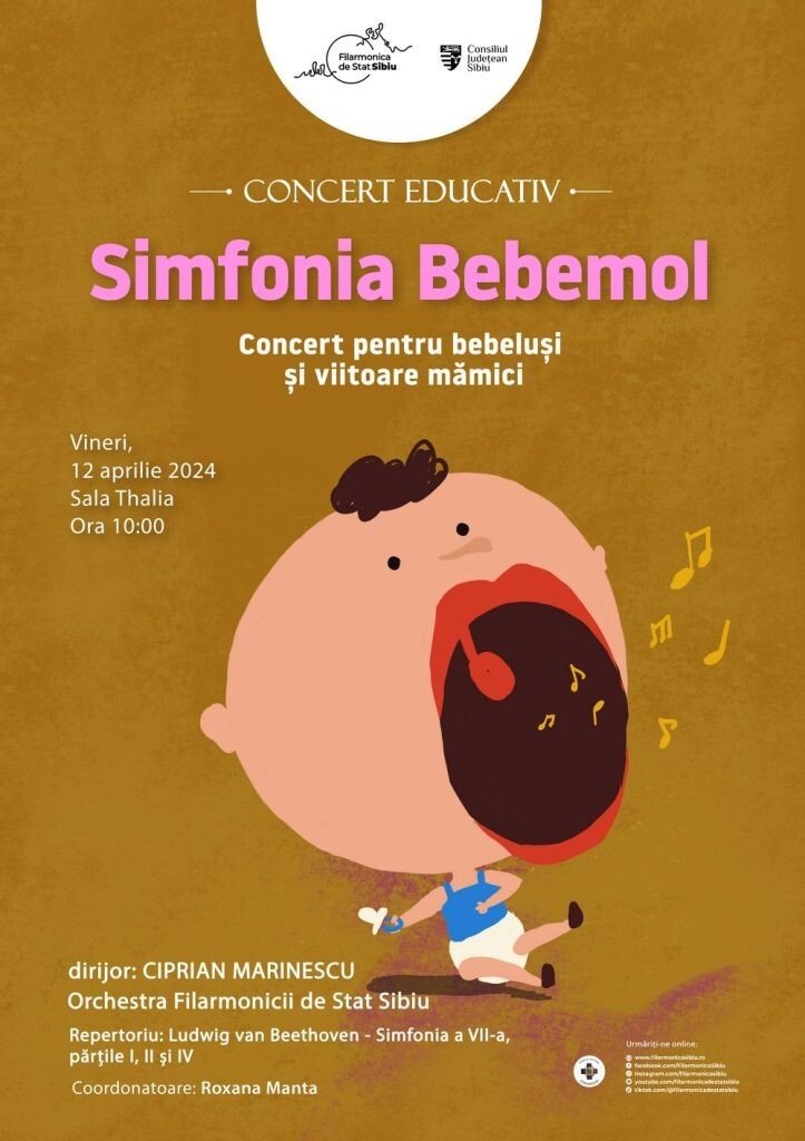La Filarmonica de Stat Sibiu, copiii sunt privilegiaţi să aibă parte de o educaţie muzicală împărtăşită de către muzicieni importanţi. Tot sub bagheta dirijorului Ciprian Marinescu, orchestra Filarmonicii va susține un concert educativ dedicat bebelușilor și viitoarelor mămici, vineri, 12 aprilie, de la orele 10.00, la Sala Thalia, cu Simfonia a VII-a în La major, op. 92 (părţile I, II, III) de Ludwig van Beethoven.