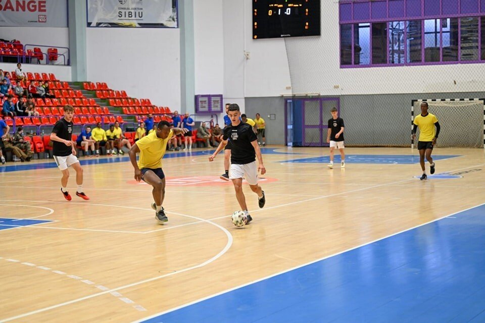 Meciul amical de fotbal desfășurat vineri la Sala Polivalentă din Sibiu între echipa NATO și cea a liceenilor de la Ghibu s-a terminat la egalitate. Pentru NATO au jucat soldații francezi de la Grupul de Luptă Francez FLF.