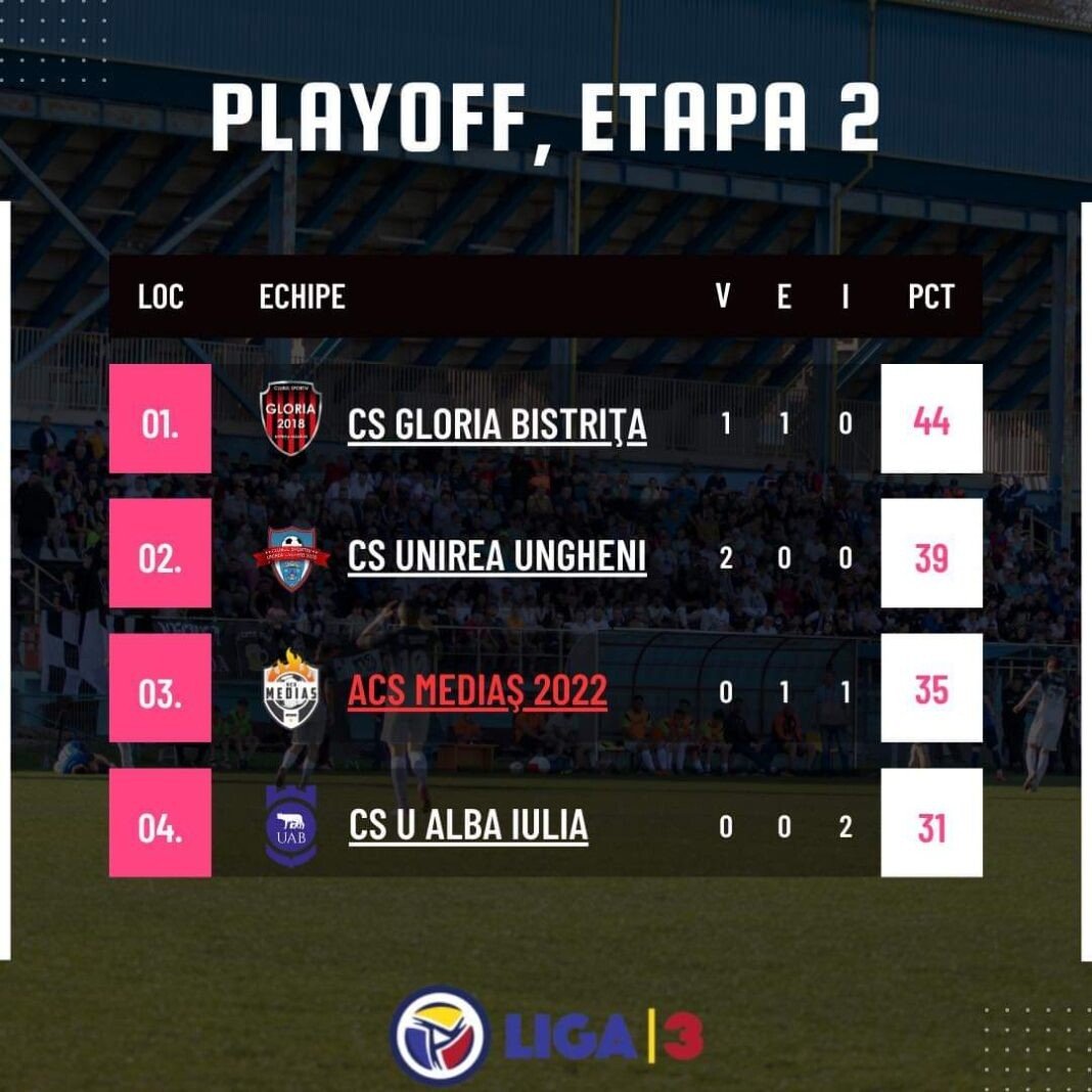 Egalul obținut în deplasare, la Bistrița, nu a ajutat-o prea mult pe ACS Mediaș. Unirea Ungheni a câștigat la Alba Iulia și are un avans de patru puncte în lupta pentru locul doi.