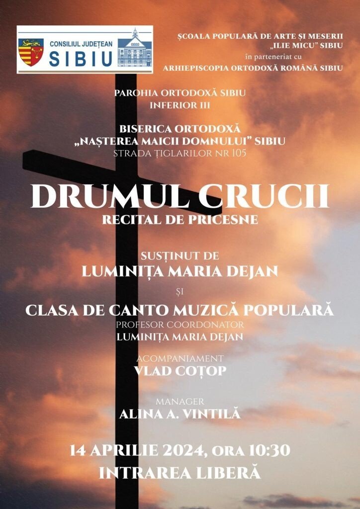 Duminică, 14 aprilie, sibienii sunt invitați la trei concerte de pricesne oferite de profesorii și elevii Școlii Populare de Arte „Ilie Micu” Sibiu cu ocazia Sărbătorilor Pascale, după cum urmează: