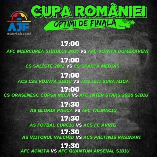 Asociația Județeană de Fotbal Sibiu a stabilit programul meciurilor din optimile de finală ale Cupei României. Partidele vor avea loc miercuri 17 aprilie cu începere de la ora 17.00 sau 17.30.