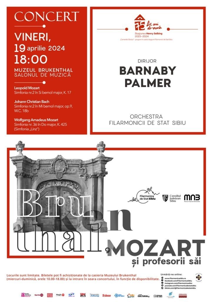 Pentru această săptămână, dirijorul Barnaby Palmer pregătește împreună cu orchestra Filarmonicii de Stat Sibiu un concert educativ care va avea loc vineri, de la orele 10.00, în Salonul de Muzică Brukenthal, cu Simfonia nr. 36 „Linz” – scrisă de genialul W.A. Mozart în doar patru zile. Apoi, la orele 18.00, publicul matur este invitat să audieze aceeași simfonie, dar și Simfonia nr. 2 în Si bemol major, K. 17, de Leopold Mozart, care a fost mult timp atribuită fiului acestuia, W.A. Mozart, precum și Simfonia nr. 2 în Mi bemol major, op. 9, W.C. 18n de Johann Christian Bach, maestrul care l-a învăţat compoziţie pe Wolfgang Amadeus pe când acesta din urmă avea doar 8 ani. Biletele pentru cele două concerte se pot achiziționa la intrare, la prețul de 20 lei (acces general). Locurile sunt limitate.