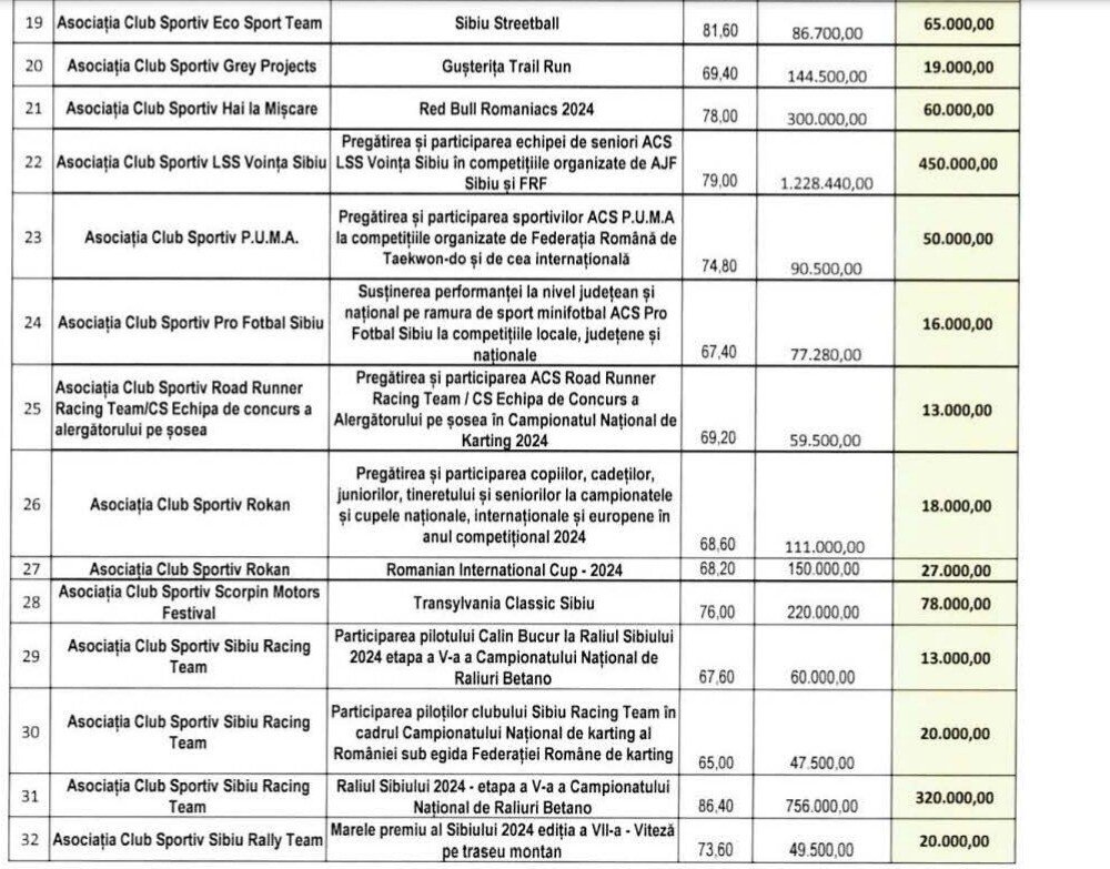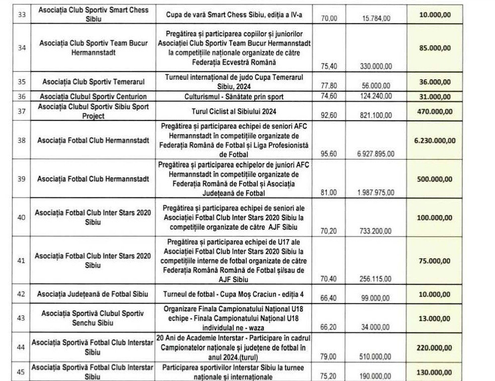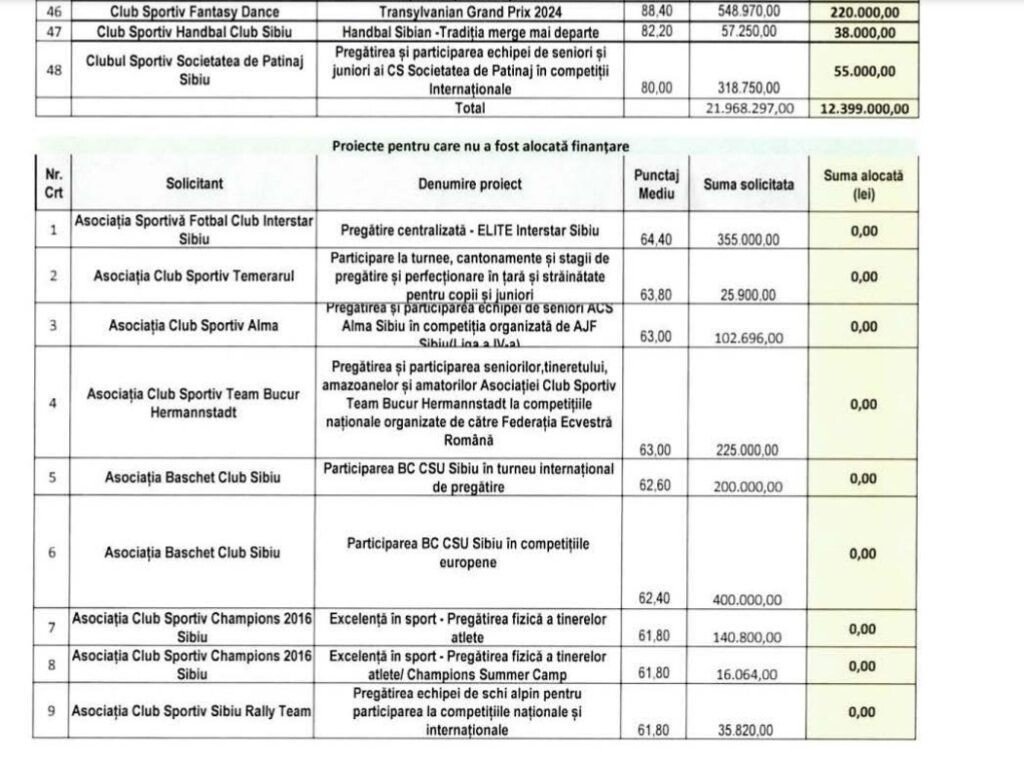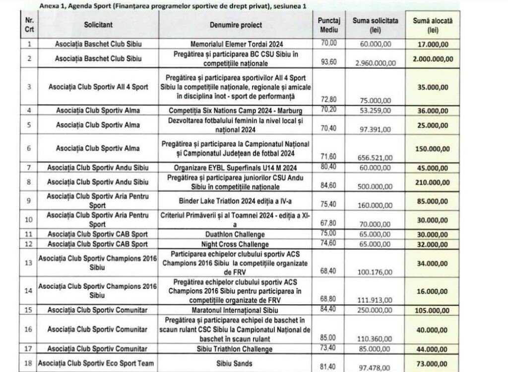 După analiza proiectelor s-a decis ca banii să se împartă astfel: 6,73 milioane de lei la echipa de fotbal FC Hermannstadt, 2,01 milioane lei la echipa de baschet CSU Sibiu. Și ce a mai rămas până la 12,39 milioane lei la toate cluburile care au avut proiecte acceptate. Cele 48 de proiecte aprobate nu au primit sumele cerute, ci mai puțin, adesea.
