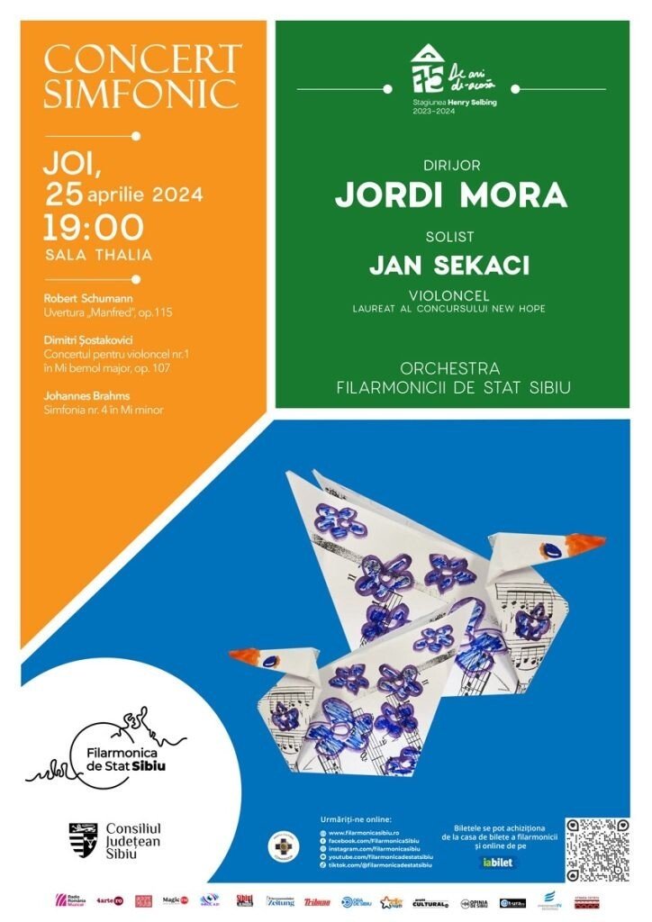 Partea dedicată violoncelului din partitura lui Șostakovici – considerat unul dintre cei mai importanți compozitori ai secolului XX – va fi interpretată de către Jan Sekaci, laureat al concursului New Hope. Invitarea acestui solist se înscrie în misiunea asumată de Filarmonica sibiană de a sprijini tinerele talente. Se cuvine să amintim pașii importanți pe care Jan Sekaci i-a parcurs în ultimii ani: printre premiile naționale și internaționale din palmaresul său se numără Premiul al III-lea la Concursul de violoncel “Antonio Janigro” din Porec – Croația, Premiul al II-lea la Concursul internațional “Young virtuosos”, desfășurat la Sofia, Premiul I la Concursul internațional “Klaipeda” din Lituania, Premiul I la Concursul “ProArt” de la Khmelnitsky – Ucraina, Premiul al IV-lea la concursul “Johannes Brahms”. Cu siguranță, profesorii care l-au ghidat și participarea la cursuri de măiestrie cu nume sonore precum: Marin Cazacu, Octavian Lup, Mihai Marica, Denis Severin, Frans Helmerson, Judith Ermert, Jacob Shaw, Romain Garioud, Raphael Pidoux, Wolfgang Emanuel Schmidt, și-au pus amprenta pe Calea pe care pășește cu o siguranță din ce în ce mai mare. Acum face parte din clasa de excelență de violoncel a renumitului violoncelist Gautier Capuçon, care a fost prezent în cadrul Festivalului Internațional “George Enescu”. Cu siguranță, acest nume se află pe o cale ascendentă datorită talentului, ambiției, dăruirii și bucuriei de a fi pe scenă. De această dată, alături de orchestra Filarmonicii de Stat Sibiu și sub îndrumarea dirijorului Jordi Mora.