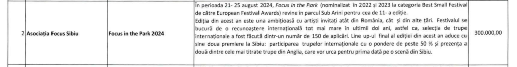 Analiza de astăzi se oprește strict la Sebastian Marcovici și Festivalul său Focus in the Park. Anul acesta, festivalul ajuns la a 11-a ediție, a primit, din nou, suma maximă de 300.000 de lei de la Primăria Sibiu.