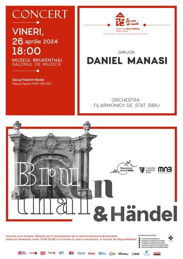Proiectul „Camerele Sibiului”, lansat de Filarmonica de Stat Sibiu în parteneriat cu Muzeul Național Brukenthal, continuă, pe 26 aprilie, cu un concert în Salonul de Muzică al Palatului Brukenthal. Sub conducerea dirijorului Daniel Manasi, orchestra sibiană va interpreta “Muzica Apelor” de Georg Friedrich Händel.