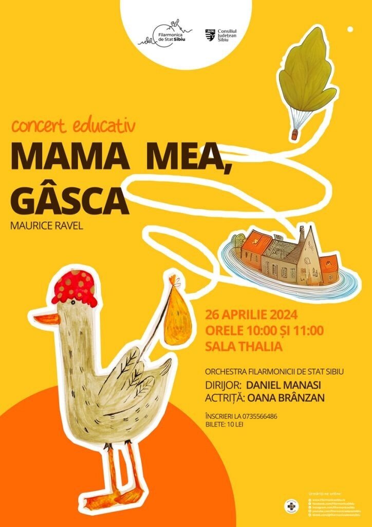 Prima parte a zilei de vineri este rezervată concertelor educative. De la orele 10.00 și orele 11.00, la Sala Thalia, cei mici vor asculta “Mama mea, Gâsca” (“Ma Mère l’Oye”) de Maurice Ravel, la 114 ani de la premiera variantei inițiale pentru pian la patru mâini (1910) și la 113 ani de la orchestrarea lucrării. În același an, 1911, în care a orchestrat varianta dedicată inițial pianului, Ravel a avut inspirația de a o dezvolta și mai mult. Mai precis, a transformat-o în balet.