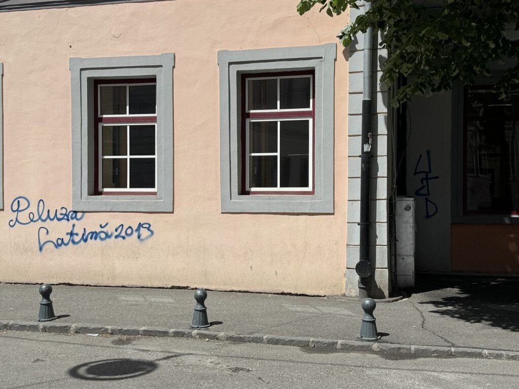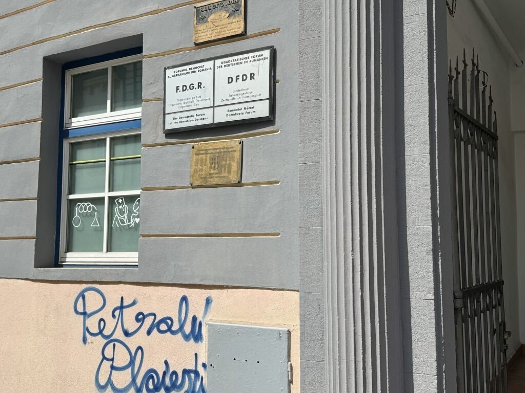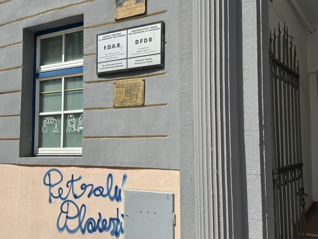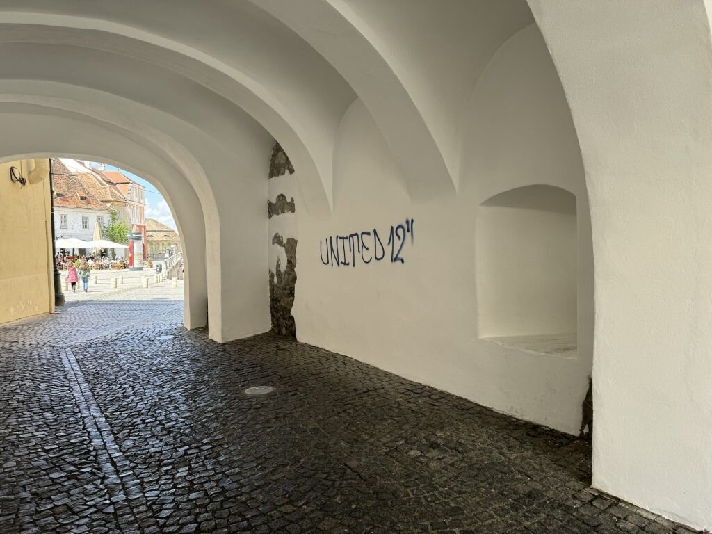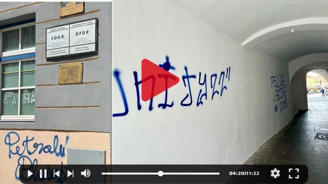Mai multe ziduri ale unor clădiri istorice din centrul Sibiului, inclusiv cei ai sediului F.D.G.R, au fost vandalizați de fanii echipei de fotbal Petrolul Ploiești.