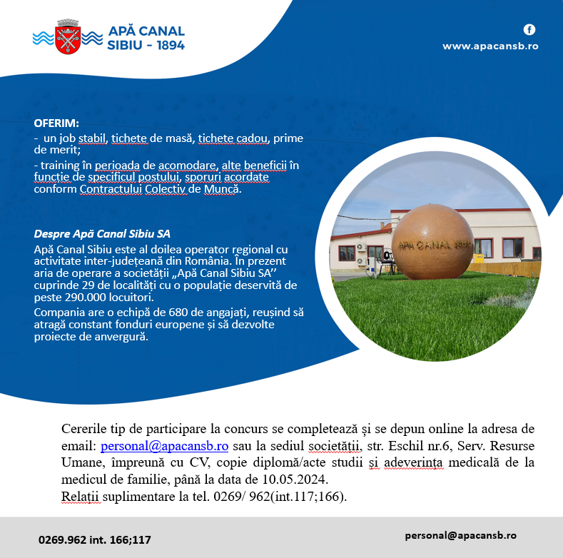 Cererile tip de participare la concurs se completează și se depun online la adresa de mail personal@apacansb.ro sau la sediul societăţii, str. Eschil nr.6, Serv.Resurse Umane, împreună cu CV, copie  diplomă studii şi adeverinţa medicală de la medicul de familie, până la data de 10.05.2024. Relaţii suplimentare la tel. 0269/ 222916 (int.117 sau 166).