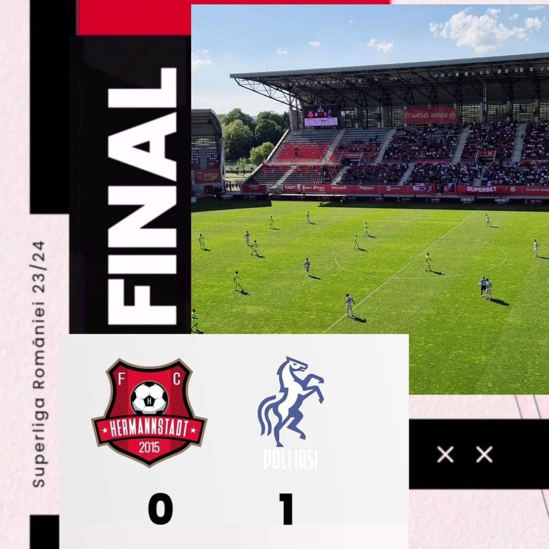 Politehnica Iași a câștigat partida disputată luni după-amiază pe Stadionul Municipal din Sibiu, scor 1-0. Fanii prezenți pe stadion au fost nemulțumiți la final, sibienii pierzând al doilea meci pe teren propriu în acest sezon.