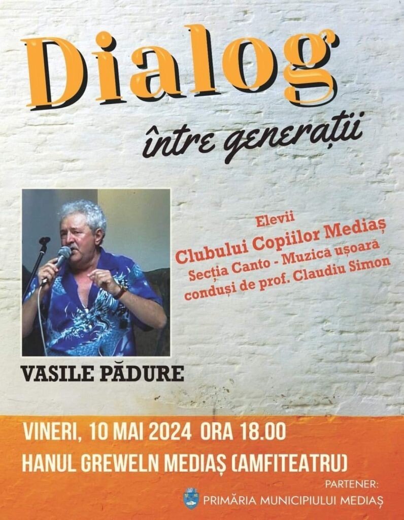 Vineri, 10 mai 2024, se va desfășura la amfiteatrul de la Hanul Greweln concertul intitulat „Dialog între generații“. Evenimentul va începe la ora 18:00 și îi are ca protagoniști pe cântărețul medieșean Vasile Pădure și pe elevii Clubului Copiilor din Mediaș, secția canto – muzică ușoară, coordonați de către profesorul Claudiu Șimon.