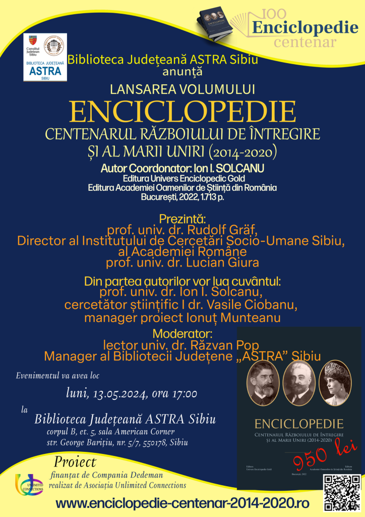Luni, 13 mai 2024, Biblioteca Județeană ASTRA Sibiu, găzduiește prezentarea volumului „ENCICLOPEDIE. Centenarul Războiului de Întregire și al Marii Uniri (2014-2020)”, apărut în 2022, la Editura Univers Enciclopedic Gold și Editura Academiei Oamenilor de Știință din România. Evenimentul se va desfășura începând cu ora 17:00, în spațiul American Corner Sibiu, la etajul 5 al bibliotecii publice sibiene, instituție de cultură care se bucură de susținerea financiară a Consiliului Județean Sibiu.