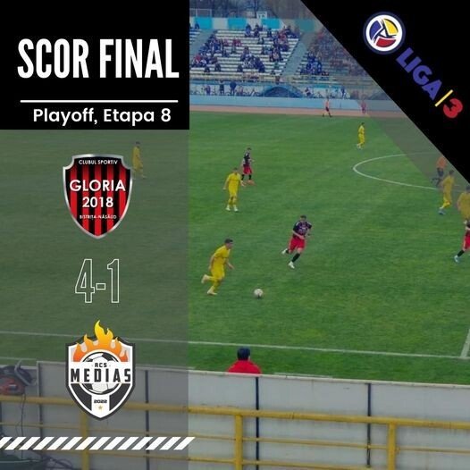 Partida a avut loc sâmbătă după-amiază pe stadionul Jean Pădureanu din Bistrița și s-a încheiat cu victoria gazdelor, scor 4-1. Golurile au fost marcate de Carl Davordzie (10, 60), Vasile Fernando Mihai (51), Vlad Mihalcea (90+2) / Szilard Magyari (15). Într-o altă partidă CS Universitar din Alba Iulia – Unirea Ungheni 3-2, după golurile marcate de Vital Ali Ouedraogo (18, 22), Bogdan Minteuan (90+3) / Răzvan Barstan (56), Victoraș Astafei (67). În clasamentul play-off-ului, seriei a noua, Gloria Bistrița și Unirea Ungheni sunt calificate la barajul de promovare în liga a doua. Gloria Bistrița este pe primul loc cu 57 puncte, urmată de Unirea Ungheni 49p, Universitar Alba Iulia 40p, ACS Mediaș 38p.