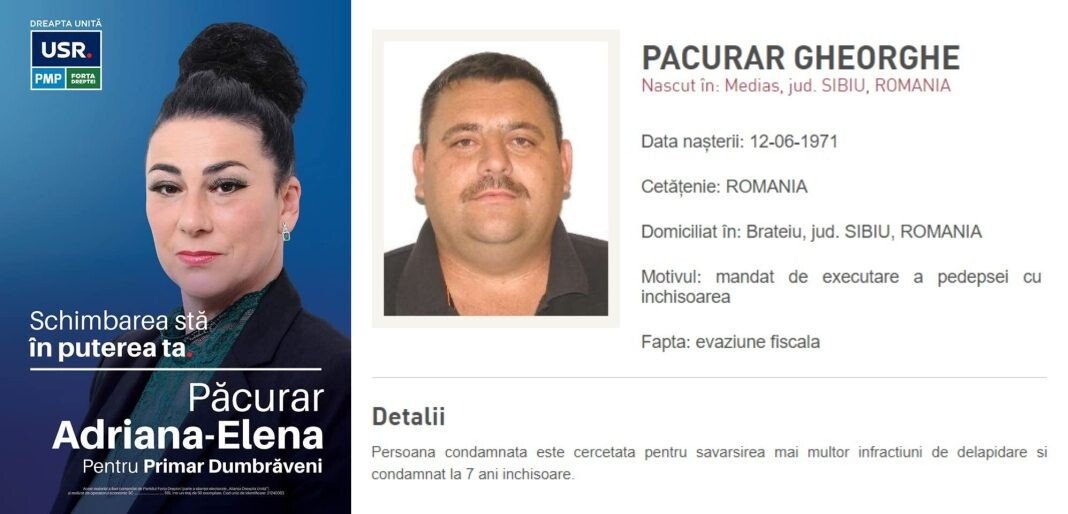 Oricine intră pe siteul Poliției Române, la secțiunea persoane date în urmărire, poate găsi poza și datele lui Păcurar Gheorghe. Acesta este dat în urmărire pentru că a fost condamnat la 7 ani de închisoare pentru delapidare și evaziune fiscală. Procesele acestuia au început din 2017 și s-au finalizat în 2022. Soția lui, Adriana Elena Păcurar este actualul candidat la funcția de primar al orașului Dumbrăveni din partea Alianței Dreapta Unită (USR+PMP+FD).
