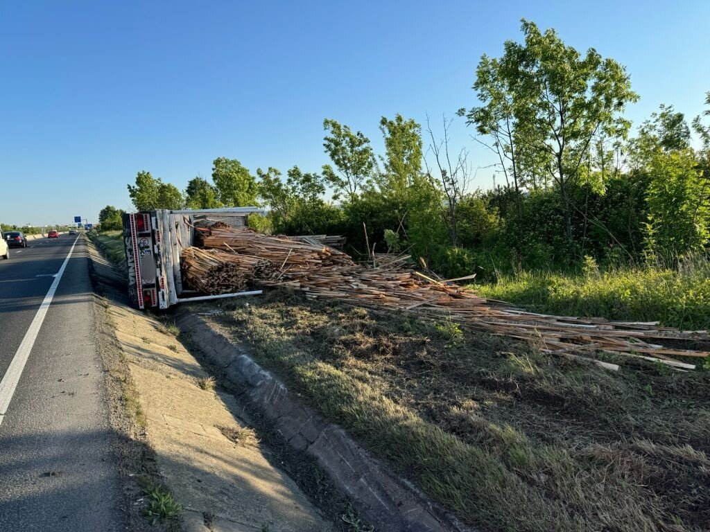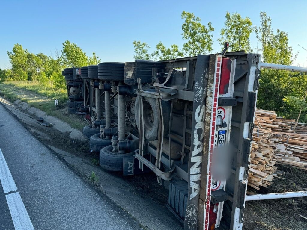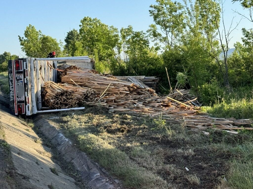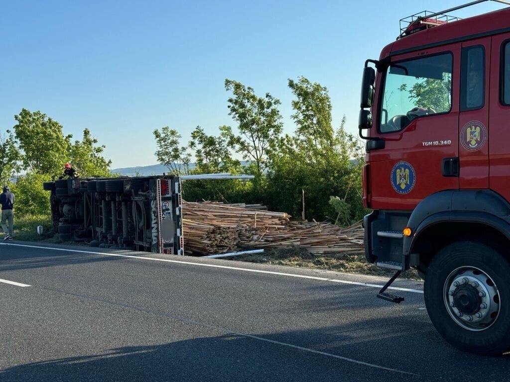 Șoferul unui autocamion încărcat cu cherestea a pierdut controlul direcției de deplasare și s-a răsturnat în afara părții carosabile.