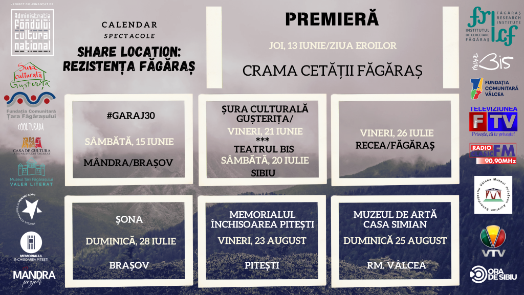 Institutul de Cercetare Făgăraș anunță calendarul evenimentelor în cadrul proiectului Share Location: Rezistența Făgăraș, un demers care aduce în prim- plan viața femeilor care au luptat împotriva comunismului. Proiectul include o piesă de teatru documetar, dezbateri publice, o expoziție și mai multe ateliere pentru copii și tineri. Sunt vizate teme mai puțin explorate ale moștenirii comuniste în societatea contemporană, cum ar fi: rolul femeilor în lupta de rezistență, memoria colectivă, trauma transgenerațională, procesul de vindecare.
