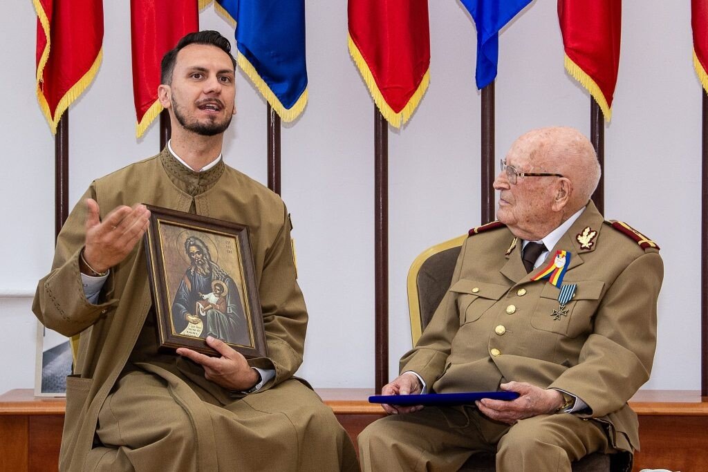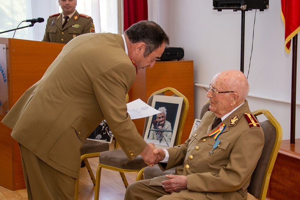 Echipat în uniformă militară, meticulos și îngrijit, s-a ridicat demn și a cântat împreună cu studenții și elevii militari Imnul Național al României, trăind intens fiecare cuvânt. Comandantul Corpului Multinațional de Sud-Est al NATO, generalul-maior Cristian DAN, prezent la eveniment, l-a asemănat pe veteranul Armatei României cu „o carte de istorie deschisă” pentru toate cele patru generații de luptători adunați în sală să îi prezinte onorul.