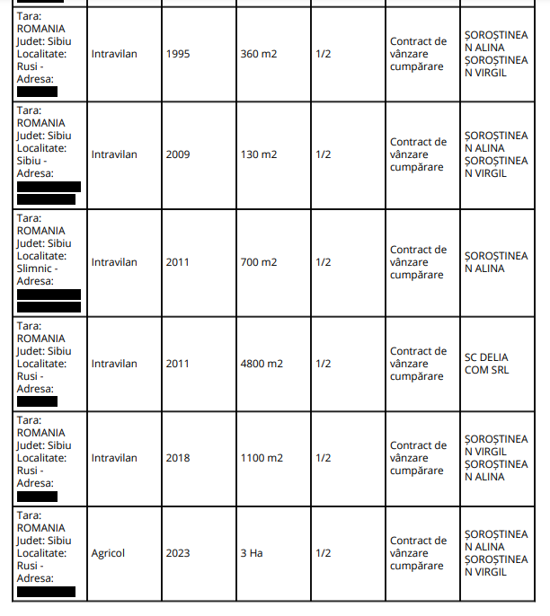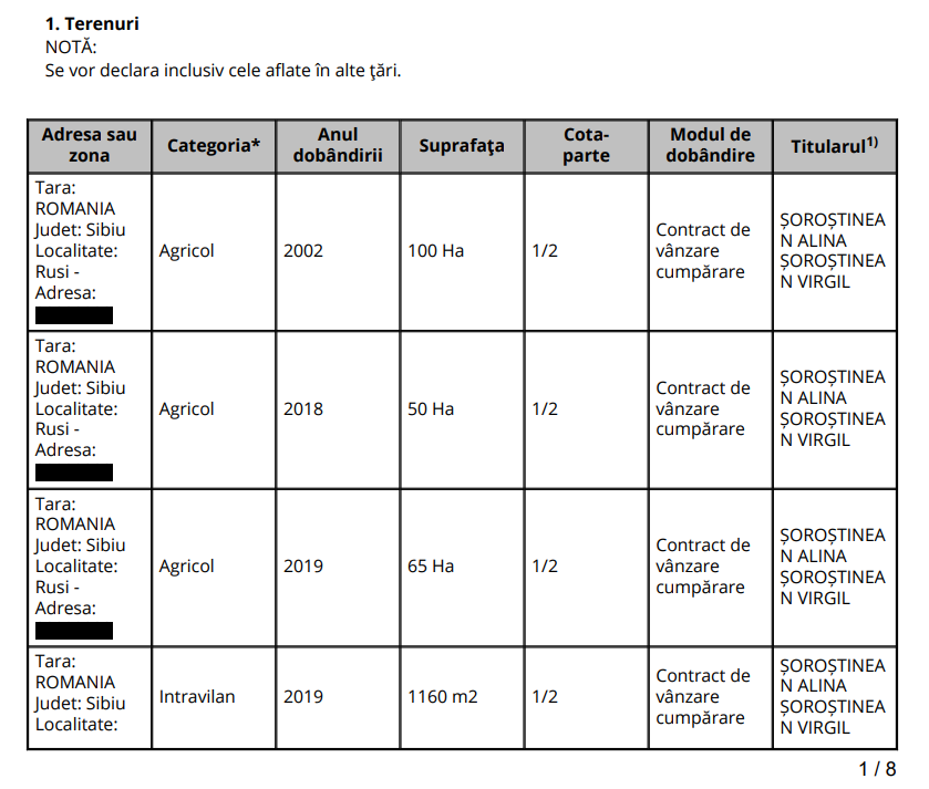 La ora actuală familia Comaromi are impozitul plătit la zi pe respectiva parcelă, deși din 2019 ea apare la Oficiul de Cadastru în proprietatea lui Virgil Șoroștinean. Mai mult au și adeverințe APIA pe ea. Și mai curios, că în declarația de avere a politicianului din 2023, parcela respectivă nu apare. (mai jos extras din declarația de avere a lui Virgil Șoroștinean)