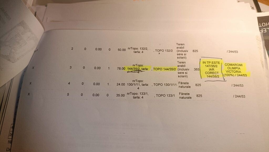 Am cerut un punct de vedere oficial la Primăria Slimnic. În titlul de proprietate deținut de Comaromi Victoria Olimpia și primit în anul 1994 apare scris 147/35/2. Dar dânsa susține că a fost o eroare materială, de scriere. Are și dovezi de la Registrul Agricol unde s-a făcut corectura și s-a precizat că parcela este 144/35/2, dar scrisă greșit în titlu.
