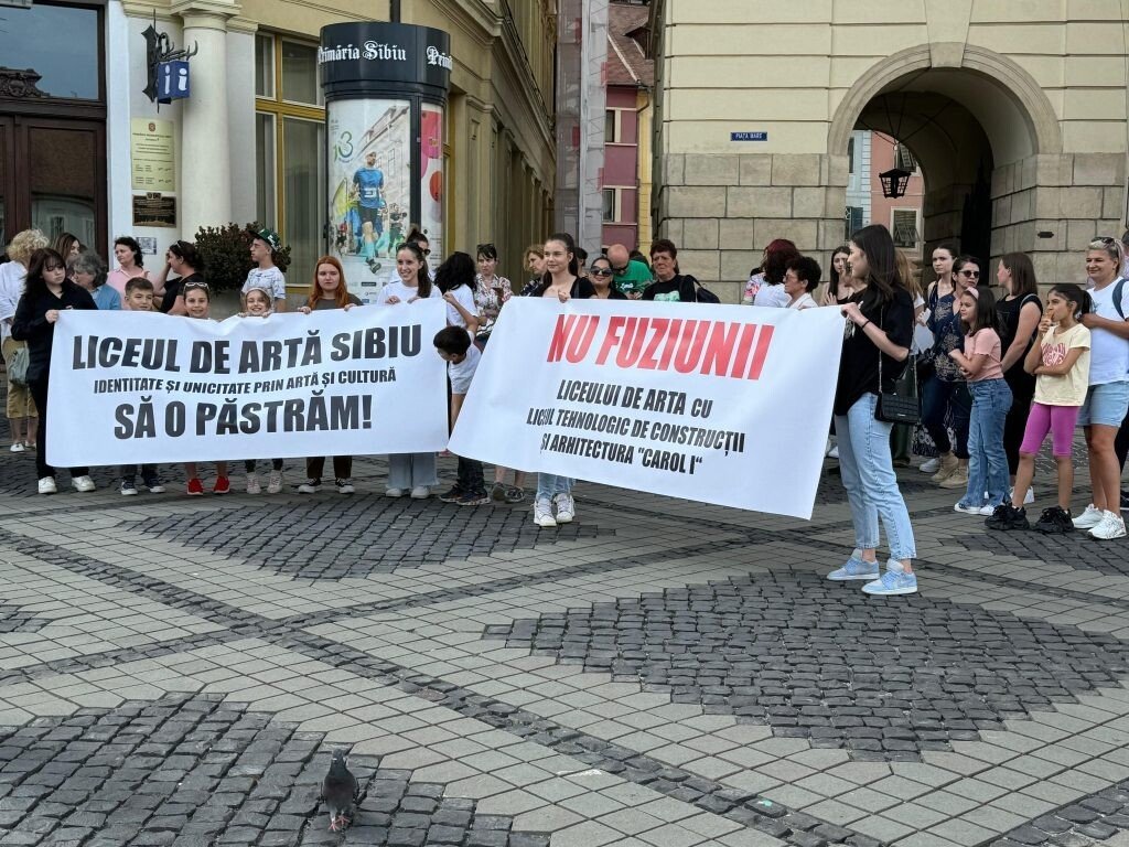 Zeci de persoane au ieșit în această seară în fața Primăriei din Sibiu pentru a protesta împotriva fuziunii cu Liceul Tehnologic Construcții si Arhitectura “Carol I” Sibiu.