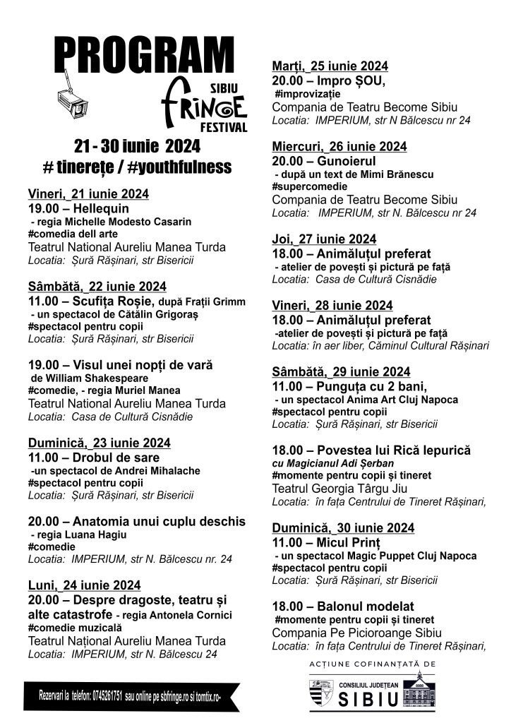 Sibiu Fringe Festival se află la a 19-a ediție, iar tema propusă în acest an este tinerețe / youthfulness. Ediția din acest an va aduce în fața iubitorilor de teatru spectacole de comedia dell arte, spectacole muzicale, comedii, performance-uri, ateliere de teatru pentru copii, momente de magie dar și spectacole pentru cei mici. Evenimentele acestei ediții vor avea loc în spații neconvenționale din mărginimea Sibiului, în Șura din Rășinari, în fața Centrului de Tineret din Rășinari, în Sibiu la Imperium Live sau în Cisnădie la Casa de Cultură.