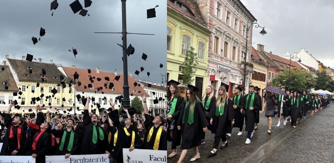 Ploaia nu a oprit festivitatea. Sute de studenți au luat parte la ceremonia de absolvire din Piața Mare a Sibiului marți, 11 iunie, începând cu ora 14:00.