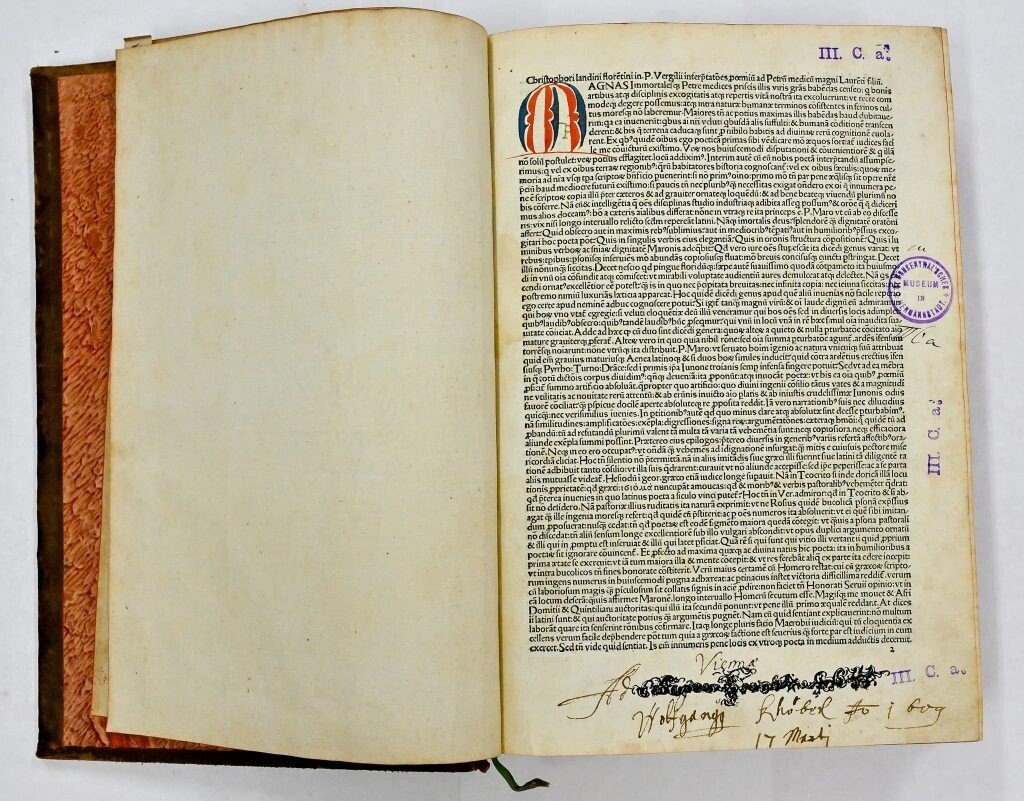 Însă cea mai veche carte cu opera lui Virgiliu pe care a avut-o Samuel von Brukenthal, încă dinainte de anul 1780, este o ediție apărută la Nürnberg în 1492. De dimensiuni medii, cu o inițială iluminată (aurită) colorată în nuanțe roșii, verzi și albastre puternice, ea a fost tipărită de unul dintre magnații pieței de carte din Germania acelor vremuri, Anton Koberger. Mult mai târziu, în secolul al XVIII-lea, exemplarul lui Brukenthal a căpătat și o frumoasă copertă din piele marmorată, cu ornamente aurite dispuse pe cotor.