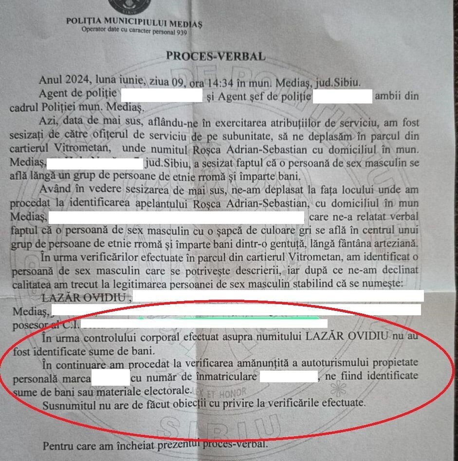 Din motive lesne de înțeles am editat procesul verbal pentru a șterge datele personale. Dar din acest document întocmit de polițiștii de la Poliția Municipiului Mediaș reiese clar că NU s-au găsit bani asupra lui Lazăr Ovidiu și nici în mașina acestuia. Mai mult, Lazăr Ovidiu a fost cooperant. A mers inclusiv la sediul Poliției Mediaș.