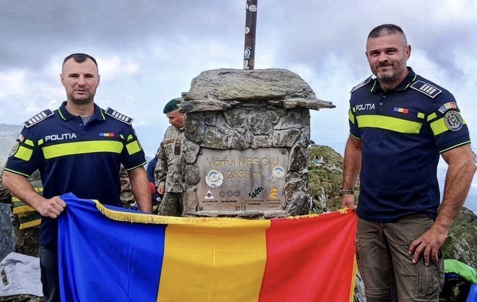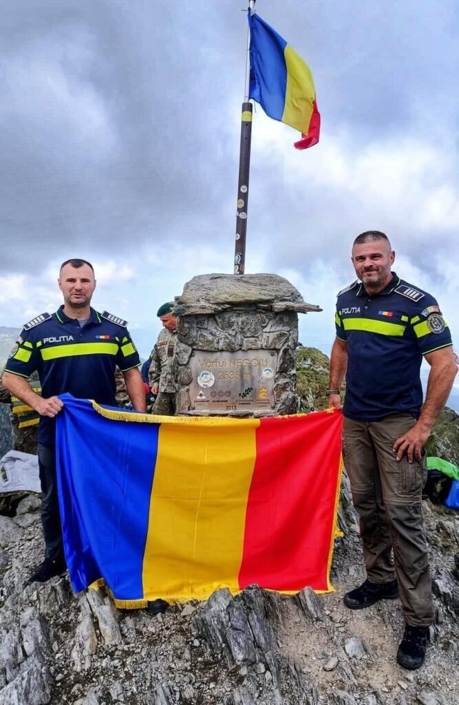 De Ziua Drapelului Național, doi polițiști din Sibiu au dus tricolorul pe Vârful Negoiu