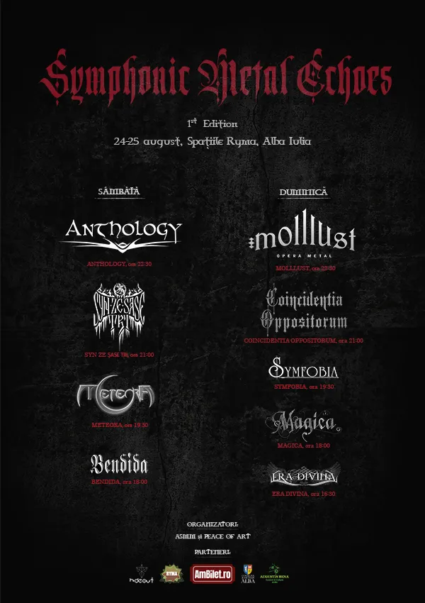 Line-up: Magica (RO), Syn Ze Șase Tri (RO), Bendida (BG), Meteora (HU), Coincidentia Oppositorum – tribute Haggard (RO), Anthology (Slovacia), Symphobia (Slovacia), Era Divina (RO), Molllust (DE).