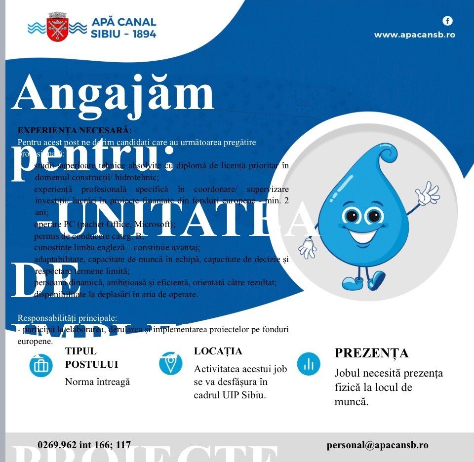 APĂ CANAL SIBIU S.A. angajează pentru Unitatea de Implementare Proiecte: