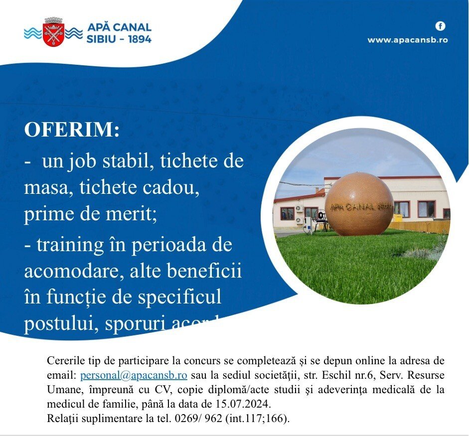 Cererile tip de participare la concurs se completează și se depun online la adresa de mail personal@apacansb.ro sau la sediul societăţii, str. Eschil nr.6, Serv.Resurse Umane, împreună cu CV, copie diplomă studii şi adeverinţa medicală de la medicul de familie, până la data de 15.07.2024. Relaţii suplimentare la tel. 0269/ 222916(int.117 sau 166).