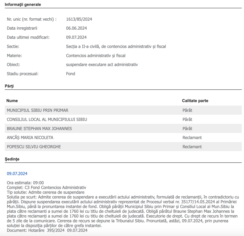 Cum vecinul sibiencei a câștigat licitația, oferind 305 euro +TVA per metru pătrat, autoritățile locale au emis act de executare, obligând proprietara să demoleze gardul și să predea terenul. Nemulțumită, aceasta a acționat în instanță părțile implicate. În cursul zilei de ieri, instanța de judecată i-a dat câștig de cauză, suspendând executarea actului administrativ, adică procesul verbal de adjudecare a licitației către câștigător. Calea este încă anevoioasă, urmând cel mai probabil contestații și alte și alte termene în acest proces în care se cere anularea licitației.