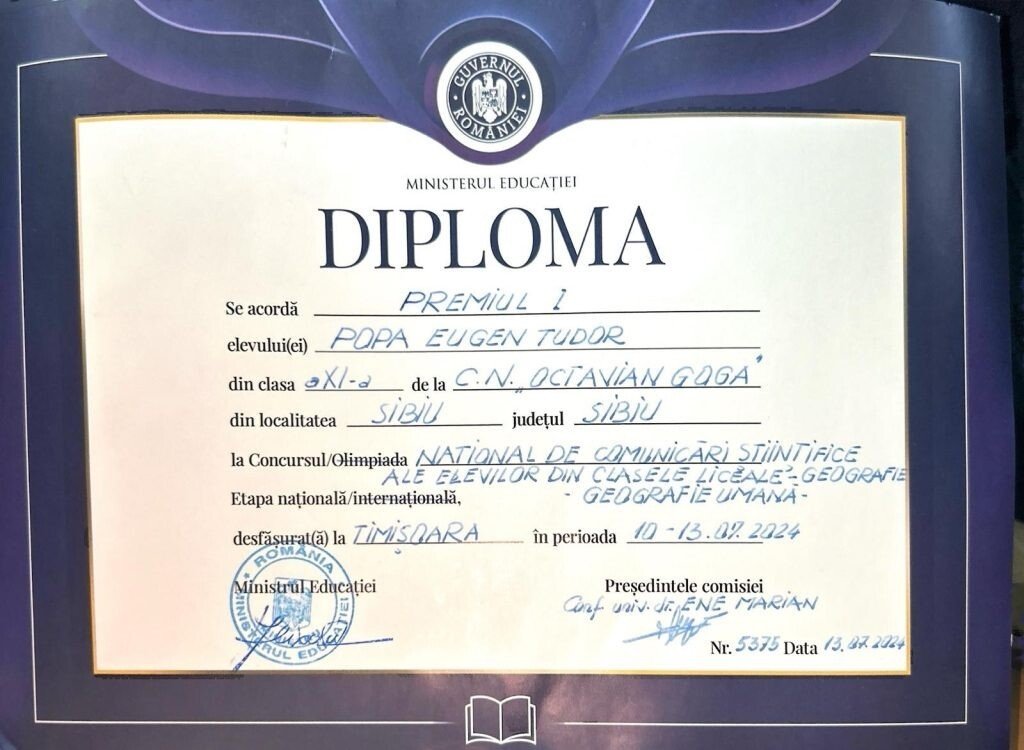 Rezultate deosebite ale elevilor sibieni la faza națională a Sesiunii de comunicări științifice ale elevilor din clasele liceale pentru disciplina geografie – PREMIUL I la secțiunea Geografie Umană