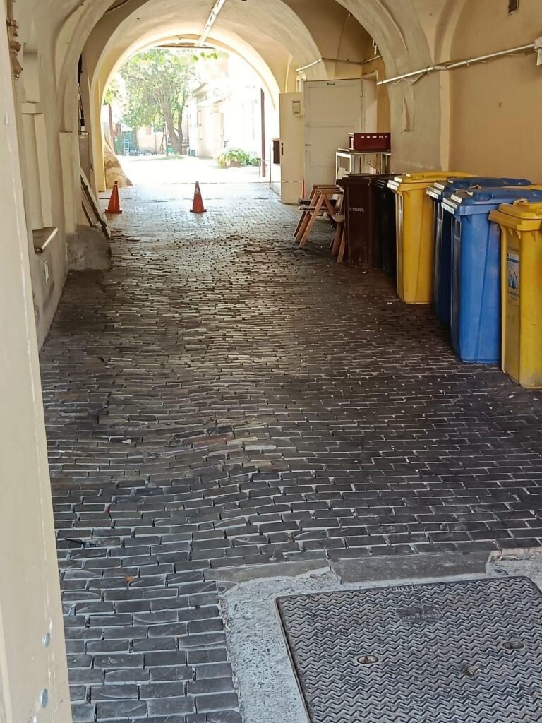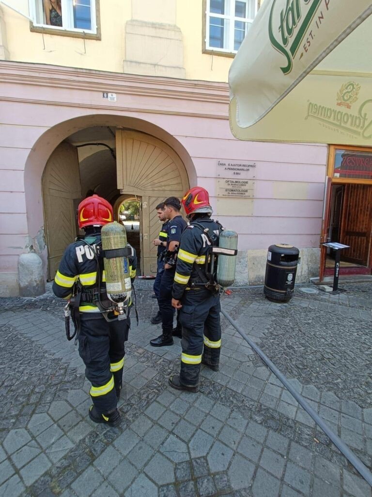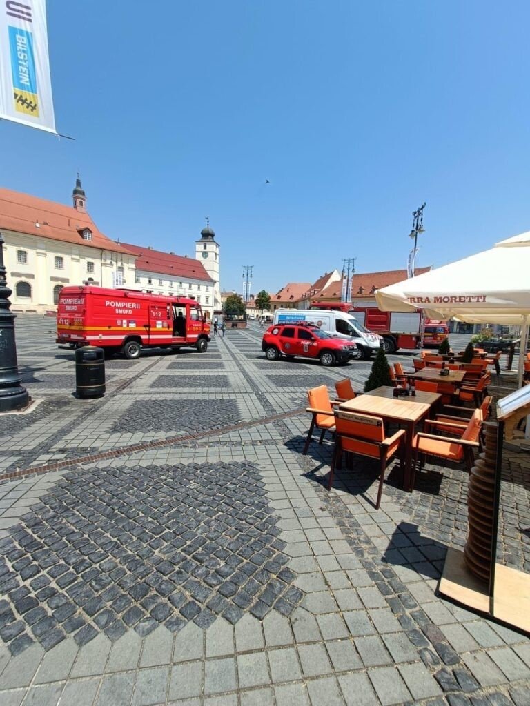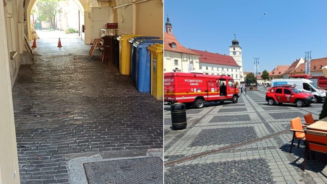 Pompierii sibieni intervin în curtea unui imobil din Piața Mare a municipiului Sibiu, în urma unui apel pe numărul unic pentru apeluri de urgență 112 care semnalează faptul că este umflat pavajul.