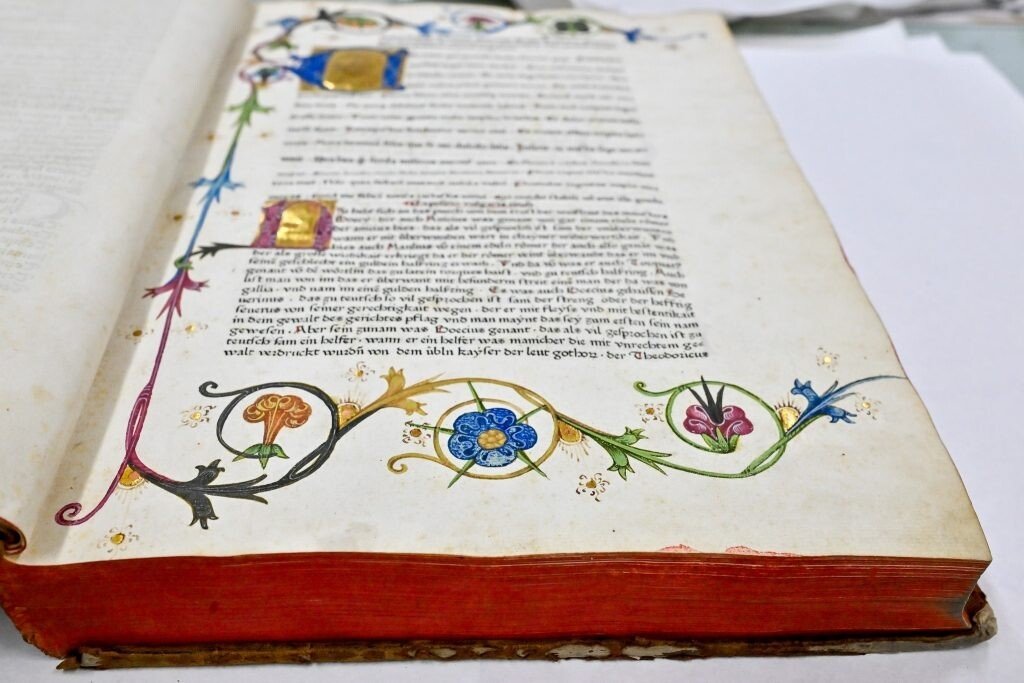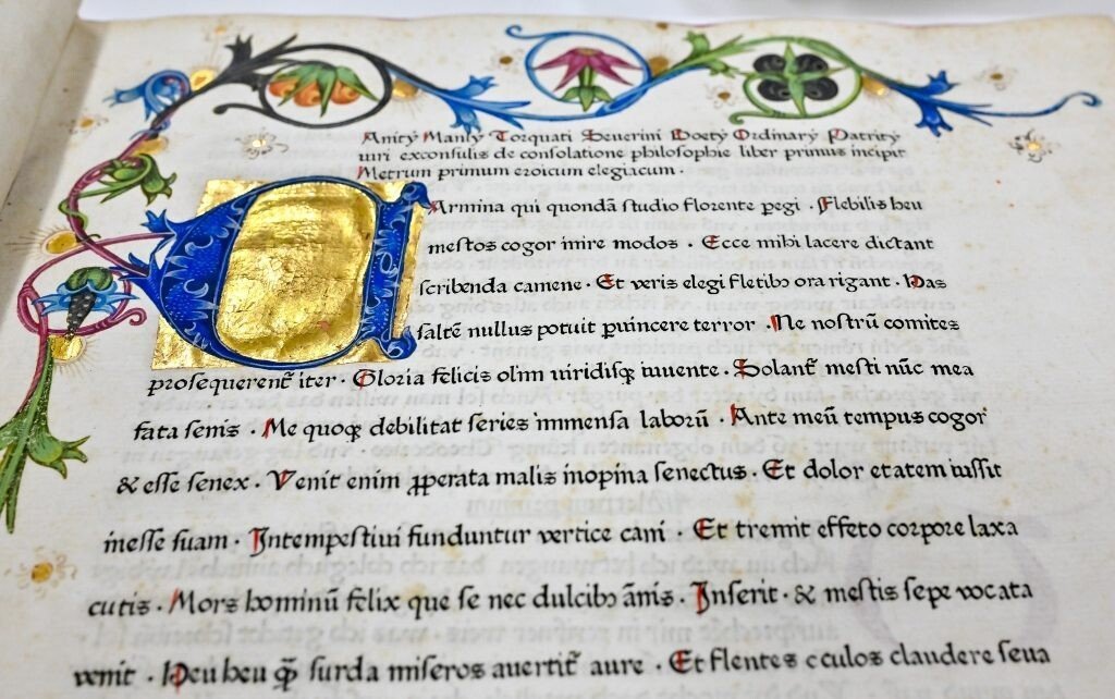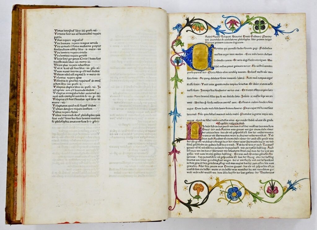 Pe lângă textul operei propriu-zise, această ediție princeps a lui Koberger din Consolarea filosofiei conține și comentariile unui alt scolastic reprezentativ pentru cultura europeană medievală, Toma de Aquino (m. 1274). Superba ediție, cu inițialele ei iluminate, prelungite cu ornamente florale intens colorate, poate fi admirată în palatul Brukenthal din Piața Mare în intervalul 17 iulie – 18 august.