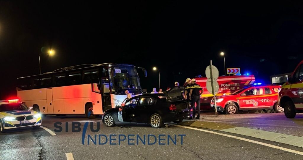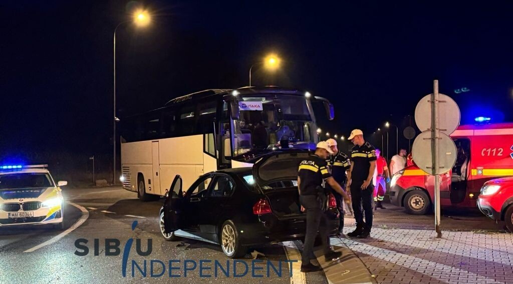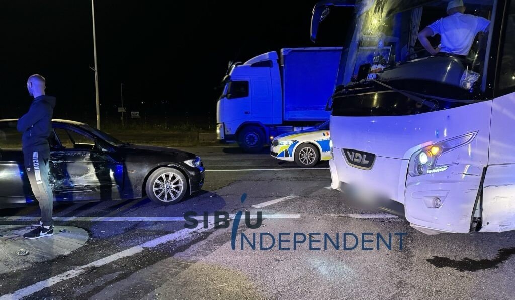Un accident de circulație s-a produs în această seară, pe Șoseaua Alba Iulia din municipiul Sibiu, în intersecția cu strada Salszburg. Un autocar plin cu călători a intrat în coliziune cu o mașină.