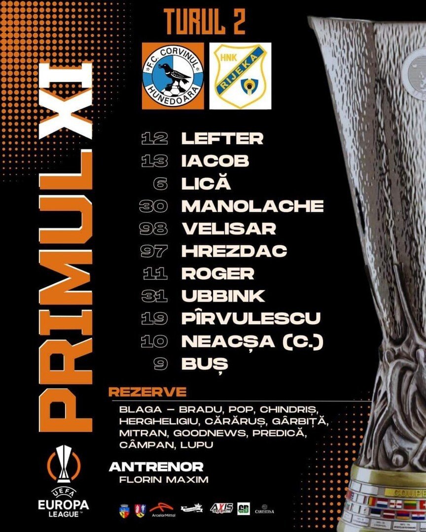 Corvinul: Lefter – F. Iacob, Lică, Manolache, Velisar – Ubbink, Hrezdac, Neacșa – Roger, S. Buș, Pîrvulescu. Rezerve: Blaga – Pop, Lupu, Bradu, Herghelegiu, Predică, Mitran, Gîrbiță, Cărăruș, Chukwu, Câmpan, Chindriș. Antrenor: Florin MaximRijeka: Zlomislic – Bogojevic, Galesic, Radejic, Cabraja – Hodza, Selahi, Patrovic – M. Pasalic, Obregon, Jankovic.Rezerve: Posavec – Kitin, Djouahra, Fruk, Ivanovic, Banda, Ilinkovic, Butic, Smolcic, Rukavina, Majstronovic, Dujmovic. Antrenor: Zeljko Sopic