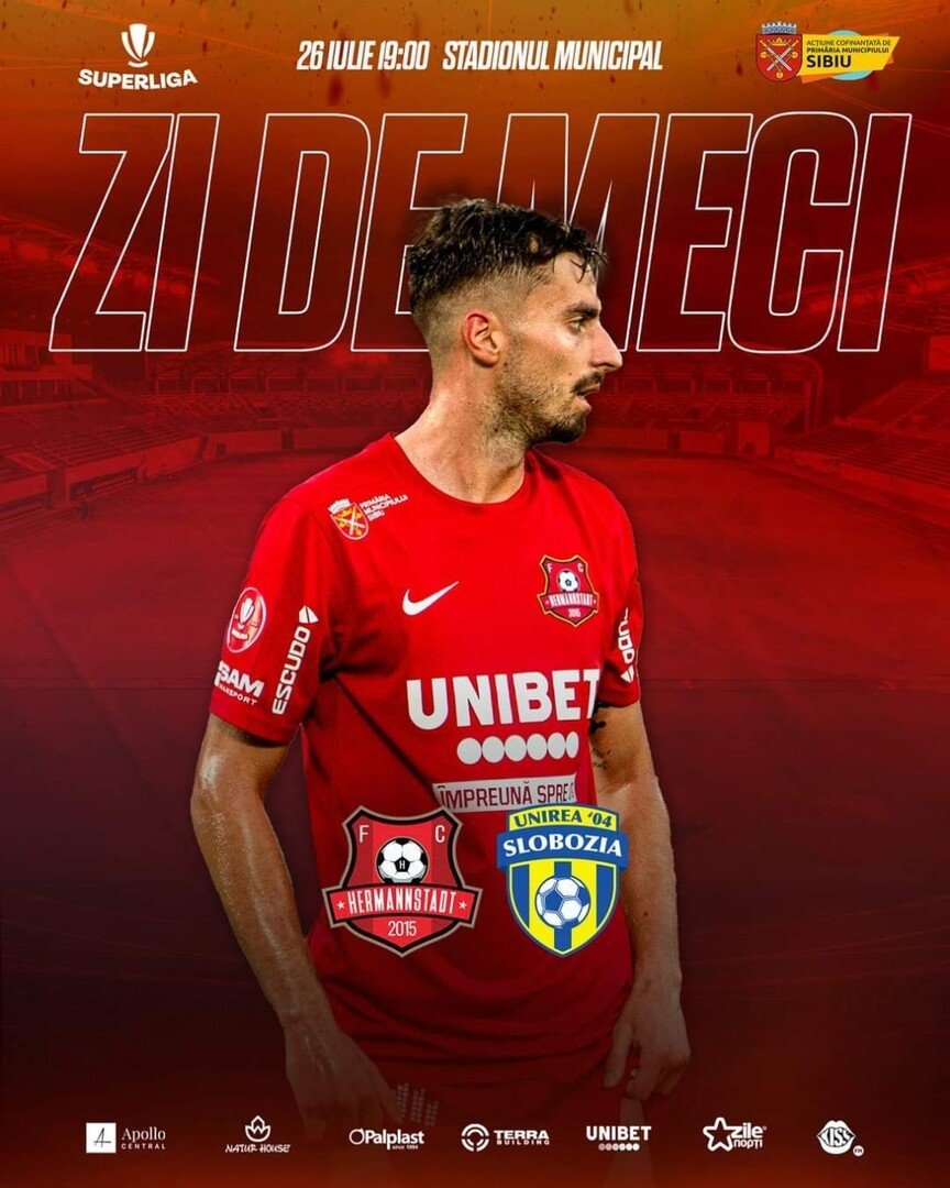 Partida dintre FC Hermannstadt și Unirea Slobozia va avea loc vineri seara, de la ora 19.00, pe stadionul Municipal din Sibiu. Meciul poate fi urmărit și pe Digi Sport și Prima Sport.