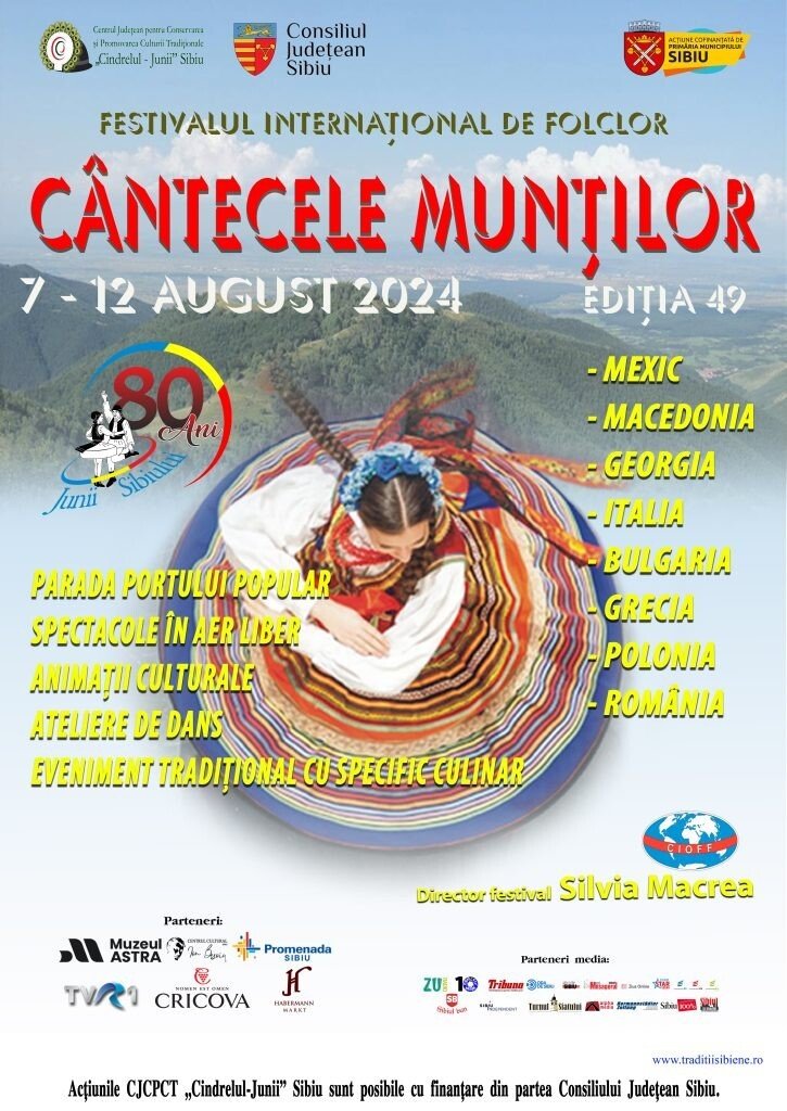 A 49-a ediție a Festivalului Internațional de Folclor „Cântecele Munților” unește țări și continente, vreme de 5 zile, la Sibiu, prin promovarea elementelor identitare, colorate prin diversitatea culturală a fiecărui ansamblu participant. Între 7 și 11 august 2024, Sibiul devine capitala folclorului internațional, marcând continuitate în tradiția organizării unuia dintre cele mai mari festivaluri internaționale din Europa, care vă propune spectacole folclorice, ateliere de dans, animații culturale în spații neconvenționale, parada portului popular și un eveniment cu specific gastronomic.