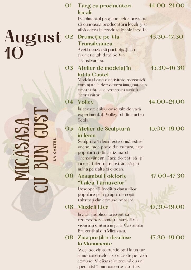 Asociația Română despre Mâncare vă invită cu drag să participați la evenimentul „Micăsasa Cu Bun Gust la Castel”, care va avea loc la Castelul Brukenthal din Micăsasa și pe traseul de drumeție Via Transilvanica. Evenimentul are loc sâmbătă, 10 august, între orele 14 – 21:00