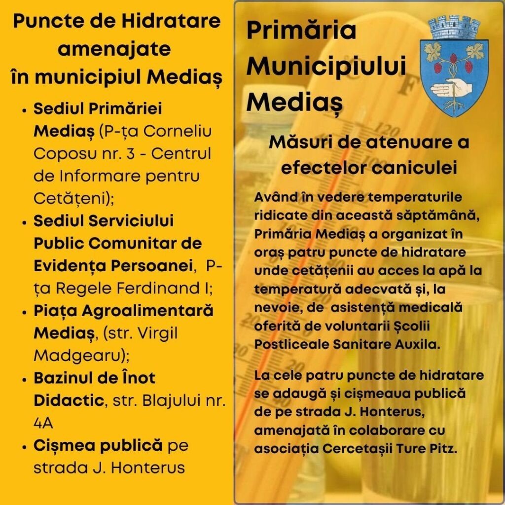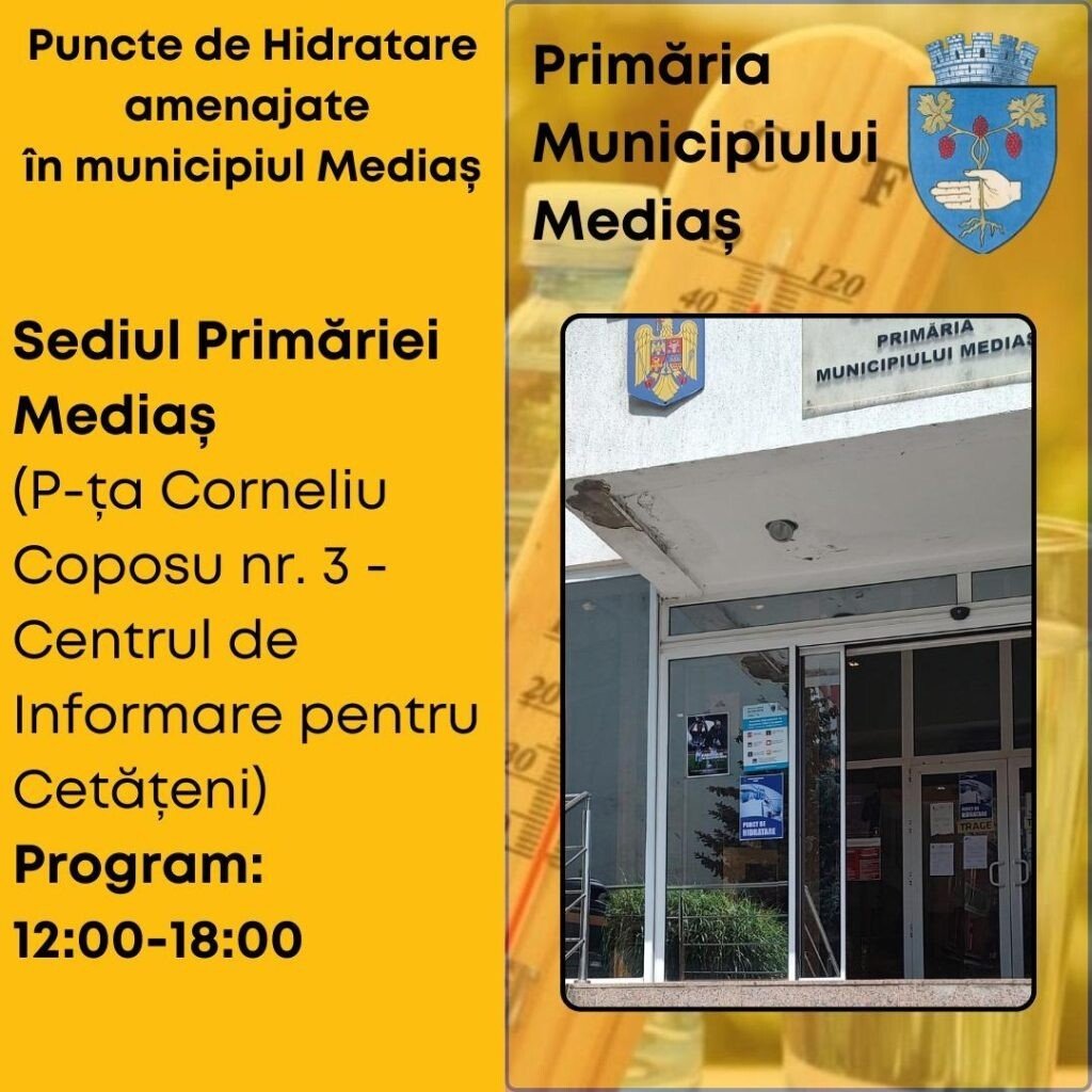 Având în vedere temperaturile ridicate de astăzi, 13 august și mâine, 14 august, Primăria Municipiului Mediaș a organizat în oraș patru puncte de hidratare unde cetățenii au acces la apă la temperatură adecvată și, la nevoie, de asistență medicală oferită de voluntarii Școlii Postliceale Sanitare Auxila.