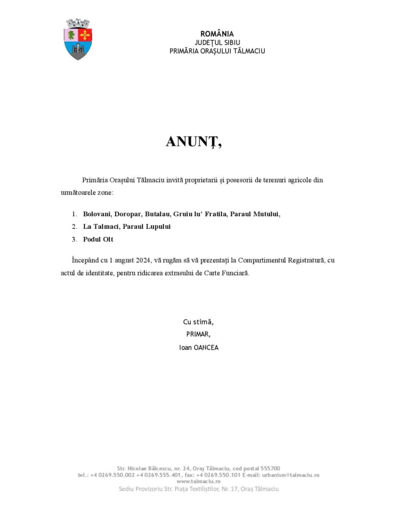 Primăria Orașului Tălmaciu informează proprietarii și posesorii de terenuri agricole că, pe parcursul lunii august, sunt invitați să se prezinte la compartimentul Registratură pentru a ridica Extrasul de carte funciară: Sunt rugați de asemenea, să se prezinte cu actul de identitate.