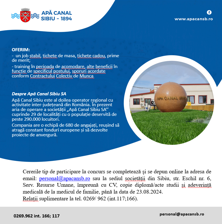 Cererile tip de participare la concurs se completează și se depun online la adresa de mail personal@apacansb.ro sau la sediul societăţii, str. Eschil nr.6, Serv.Resurse Umane, împreună cu CV, copie diplomă studii şi adeverinţa medicală de la medicul de familie, până la data de 23.08.2024. Relaţii suplimentare la tel. 0269/ 222916 (int.117 sau 166).