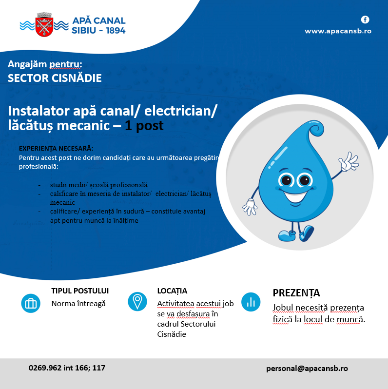 Apă Canal Sibiu angajează personal pentru Sectorul CISNĂDIE: